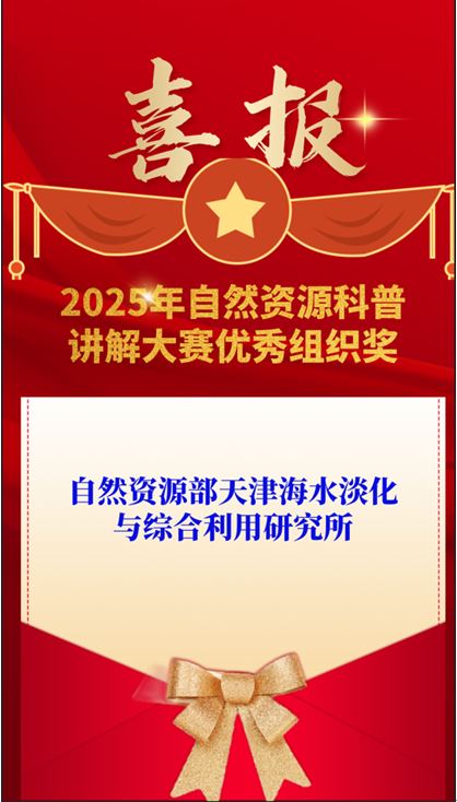 我所荣获2025年自然资源科普讲解大赛优秀组织奖!此次获奖是对我所开展系列科普工作的肯定。下一步,我所将积极配合部科普工作办公室,围绕"提升全民科学素质 夯实科技强国基础"主题,通过科普展览、技术讲座、实验室开放日等形式,在自然资源全国科普月期间重点普及海水淡化知识,进一步提升公众对海水淡化的认知,为科技强国建设贡献科普力量。