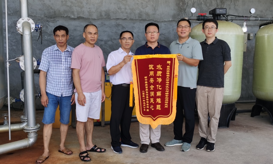 在琼中县政府等多部门协助配合下,经前期调研及水质取样分析,环境室团队设计了锰砂过滤和活性炭吸附为主体的水质净化工艺,并建设6m3/h的水处理设备1套,有效去除水体锰离子和悬浮物等污染物,实现科技助力精准帮扶,保障了当地居民的饮水安全,又为群众办了一件实事。
