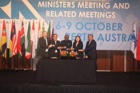 10月6日至9日,环印度洋地区合作联盟(以下简称环印联盟)第14届部长理事会在澳大利亚珀斯召开。由中国外交部张明副部长带队,外交部、国家海洋局、中国国际贸易促进委员会派员组成的中国代表团应邀参加本次会议。我所李琳梅所长参加了本届部长理事会,并在会上代表我所与环印联盟区域科技转移中心主任M. Molanejad教授共同签署了“中国国家海洋局天津海水淡化与综合利用研究所(ISDMU)与环印度洋地区合作联盟区域科学技术转移中心(RCSTT)关于技术合作、转移和交易(主要关于海水淡化技术)的谅解备忘录”?;酚×嗣厥榇吐种抵飨拇罄怯泄毓僭背鱿ち吮竿记┳忠鞘健?br>